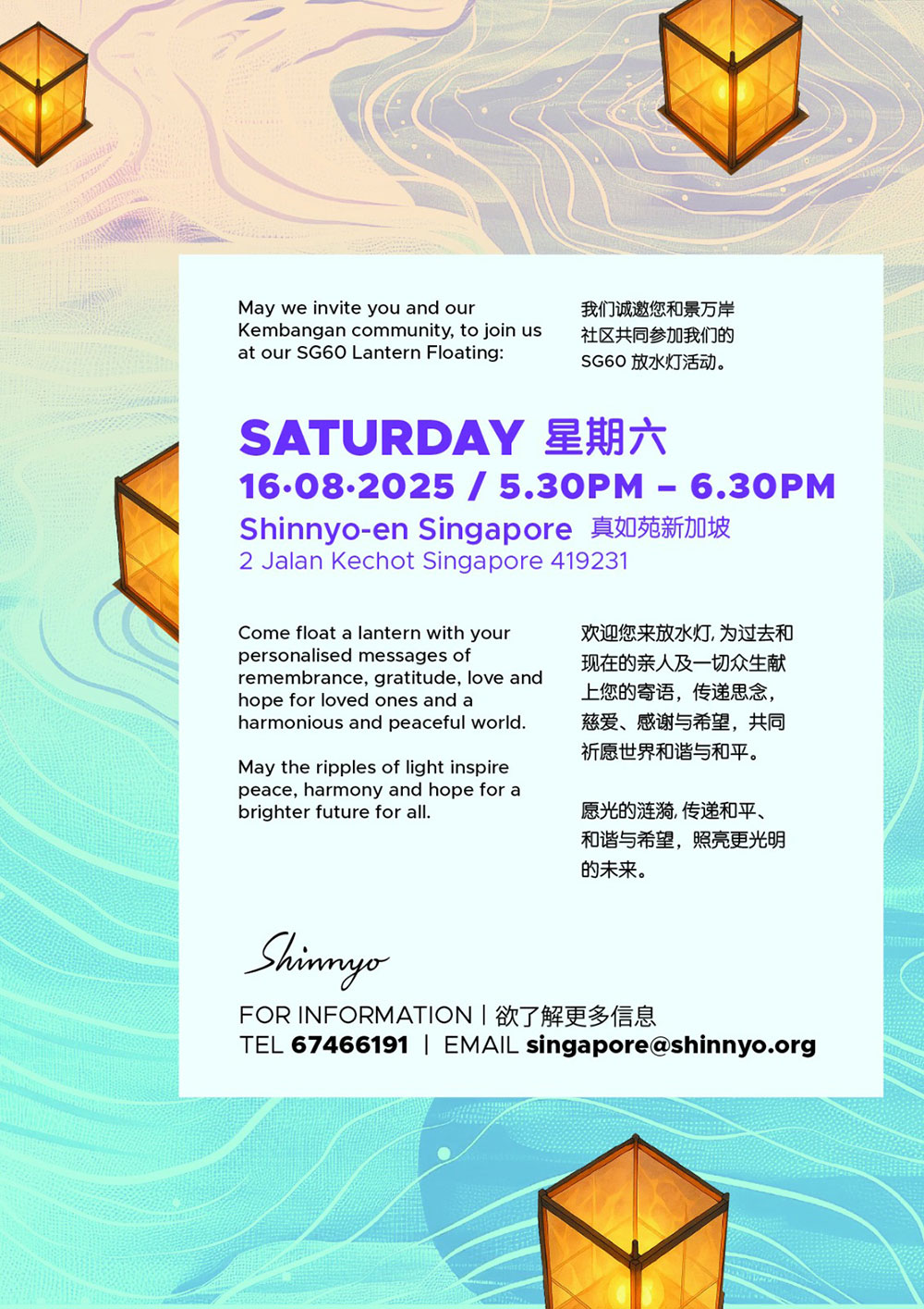 As we celebrate this milestone, Shinnyo-en Singapore would like to express our gratitude to our forebearers who laid our nationโs foundations and to all who continue to nurture its growth. In honour of SG60, we would like to invite our neighbours, friends, and community to join us in our Lantern Floating event, a gathering to express remembrance, gratitude, love, and hope for a brighter and peaceful world.