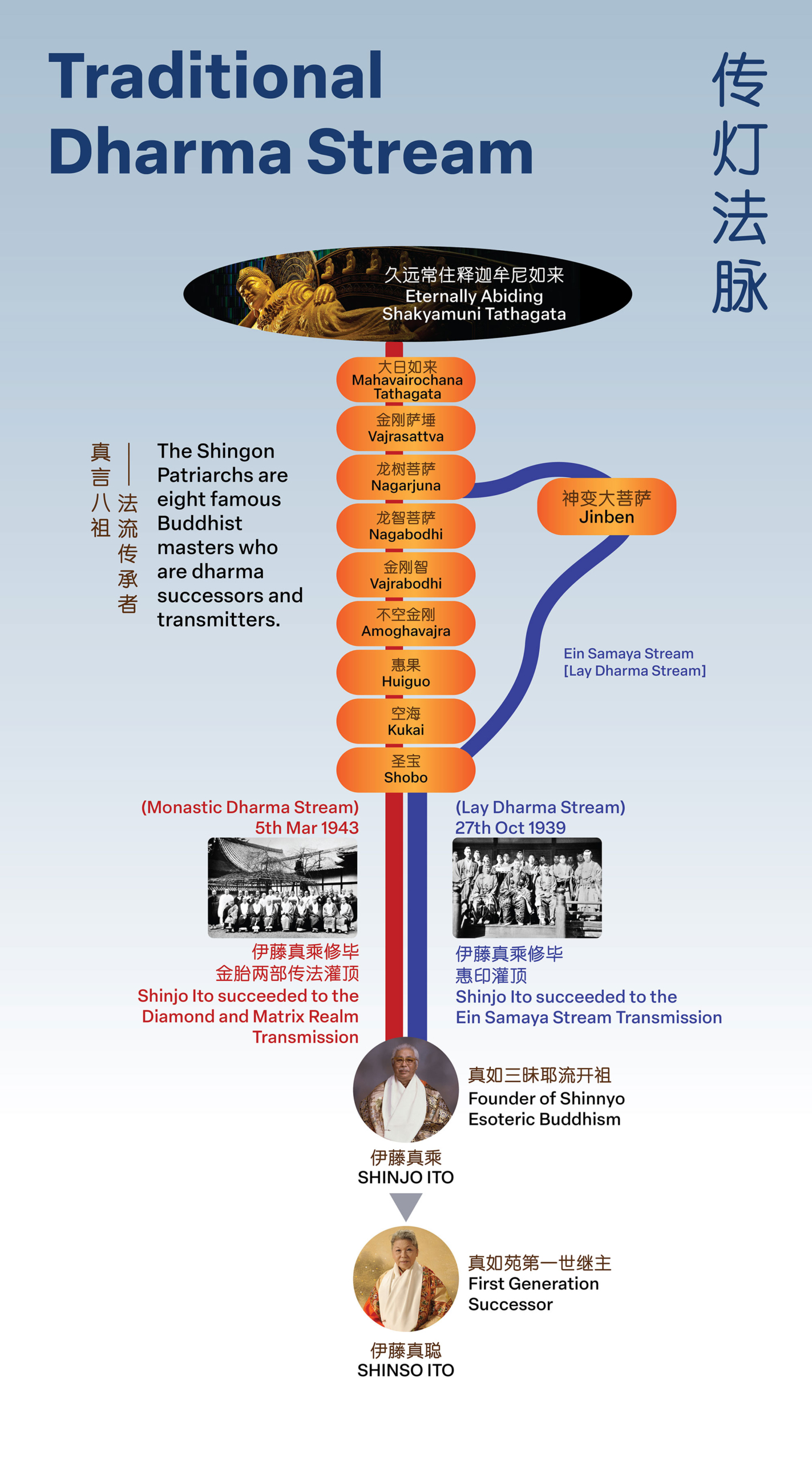 In 1939, he completed the Ein transmission for the lay dharma stream and in 1943 he was conferred as a Great Acharya or Great Dharma Master after mastering the esoteric monastic dharma transmission, which allowed Master Shinjo to establish his own lineage of practice.